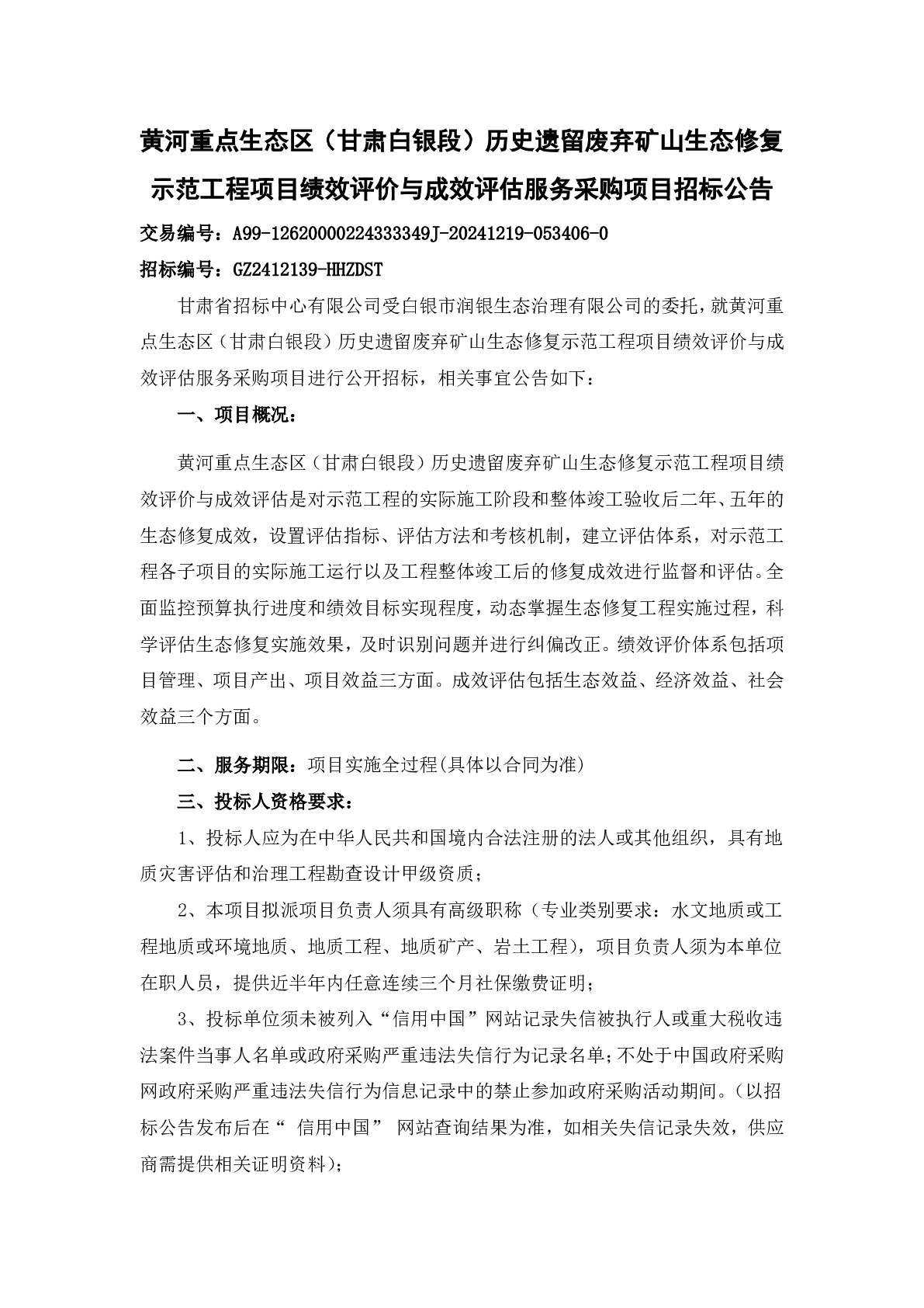 黃河重點生態(tài)區(qū)(甘肅白銀段)歷史遺留廢棄礦山生態(tài)修復 示范工程項目績效評價與成效評估服務采購項目招標公告