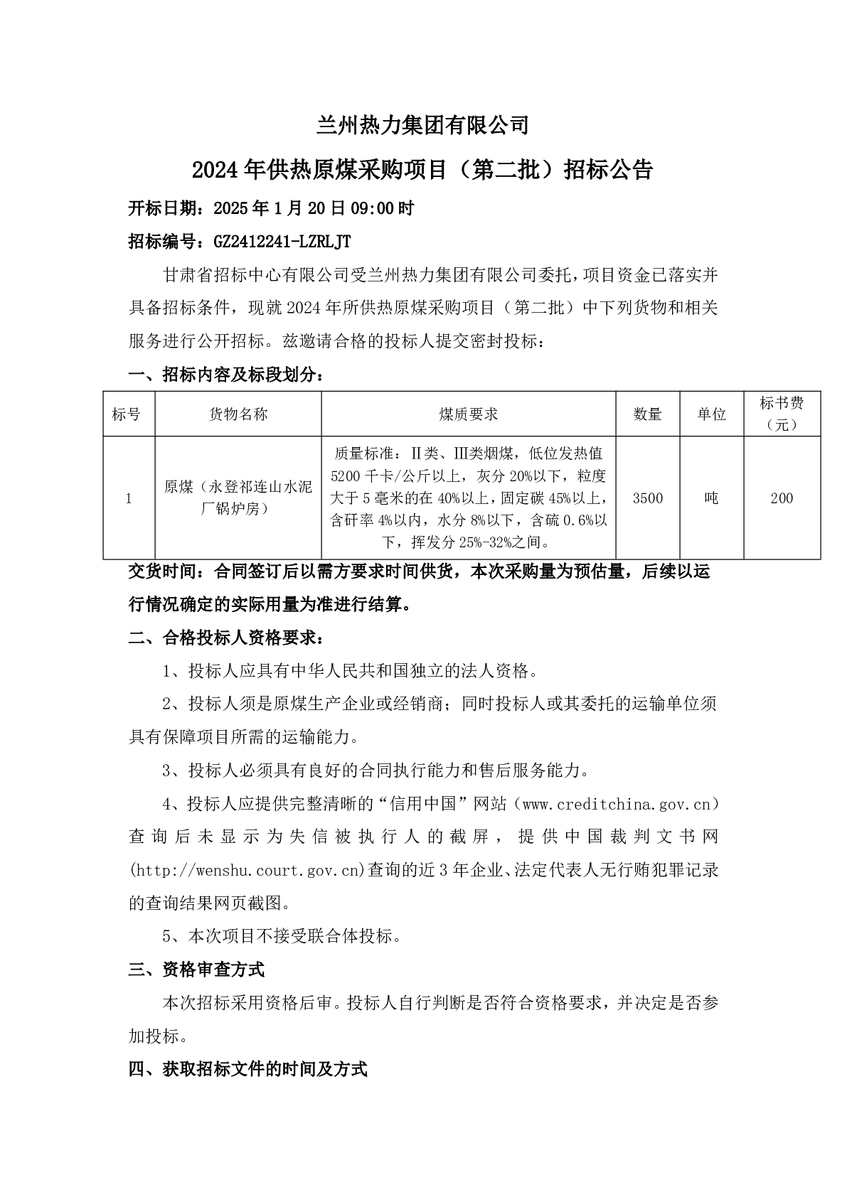 蘭州熱力集團有限公司 2024 年供熱原煤采購項目(第二批)招標公告