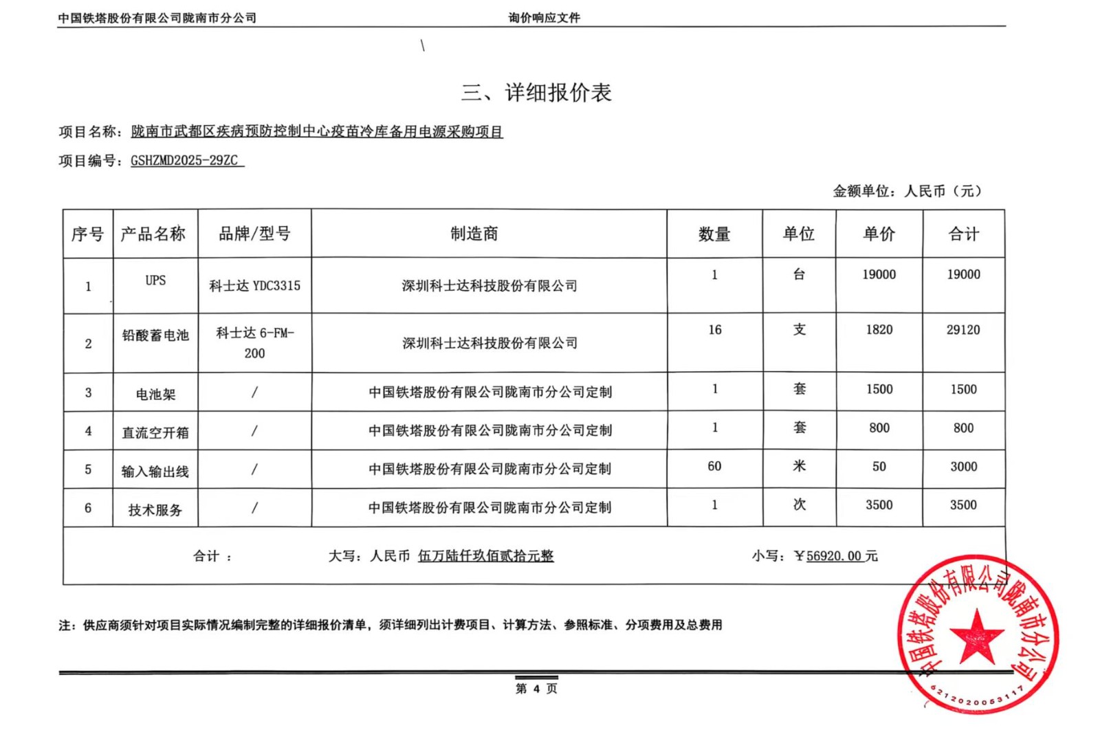 甘肅合眾明德招標(biāo)代理有限責(zé)任公司 受?隴南市武都區(qū)疾病預(yù)防控制中心 的委托,對?隴南市武都區(qū)疾病預(yù)防控制中心疫苗冷庫備用電源采購項(xiàng)目 以?詢價(jià) 方式進(jìn)行采購,詢價(jià)小組于2025年09月19日確定成交結(jié)果,現(xiàn)將結(jié)果公布如下: