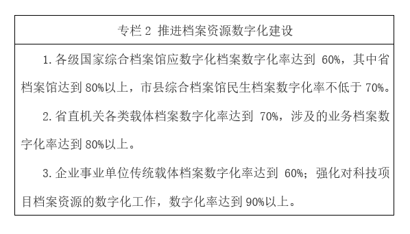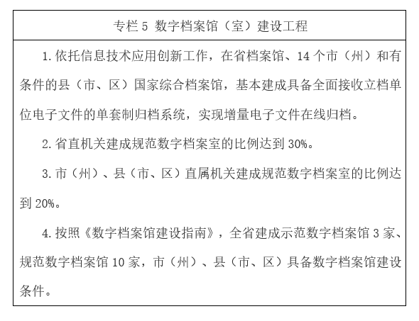 ????18.推進數字檔案館(室)建設。依托全省信息化基礎設施建設環(huán)境,充分利用電子政務內外網和互聯網平臺,建設適應檔案館(室)數字檔案管理需要的網絡平臺。在試點基礎上全面推動全省數字檔案館(室)建設,加強大數據、人工智能等新一代信息技術在數字檔案館(室)建設中的應用,推動數字檔案館(室)建設優(yōu)化升級,基本建成符合檔案館(室)業(yè)務實際功能要求、與全省國民經濟和社會信息化水平相適應的數字檔案館(室)體系。推動各級國家檔案館全面建成檔案信息管理系統,機關、團體、企事業(yè)單位和其他組織建設與辦公自動化系統、業(yè)務系統相互銜接的電子檔案管理系統。