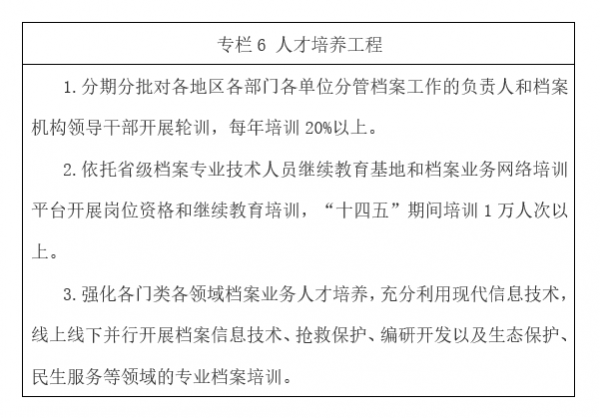 ????23.拓寬人才培養(yǎng)渠道。深化與各級黨校(行政學院)和高等院校合作,建設檔案人才培養(yǎng)基地,開展檔案人才培養(yǎng)方面學術理論和教育培訓交流活動,分期分批開展政治理論和檔案信息技術、搶救保護、編研開發(fā)等業(yè)務輪訓。推動在甘高等院校開設檔案專業(yè)學科,加快檔案高層次應用型人才培養(yǎng)。落實《檔案專業(yè)人員繼續(xù)教育規(guī)定》,加強繼續(xù)教育師資隊伍建設,推動繼續(xù)教育形式多樣化,完善繼續(xù)教育學時制度,優(yōu)化繼續(xù)教育課程和教材,強化數字課程開發(fā),推進教育資源共享,促進檔案教育培訓和互聯網融合發(fā)展。培育支持檔案職業(yè)教育,建立職業(yè)技能實訓基地,探索檔案技能型人才培養(yǎng)新路徑。優(yōu)化省市縣三級工作學習交流平臺,探索建立互派干部掛職、跟班學習機制。強化與其他省份檔案部門和高等院校的聯系,建立完善長效合作機制,積極開展跨省學習交流、人員掛職等合作。拓寬檔案干部遴選、招錄渠道,為各級檔案部門引進專業(yè)人才。