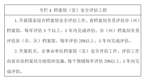 ????檔案安全防線得到新加強。檔案安全工作機制和管理制度更加完善,庫房和設施設備功能齊全、安全可靠,人防、物防、技防三位一體安全防范體系更加完備,檔案安全風險評估管控、隱患排查治理成效和應急管理能力明顯提升。