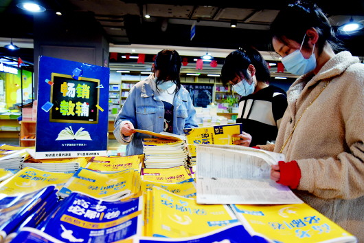 2月24日,幾名學生在我市一家書店選購教輔讀物。新學期即將開學,不少學生和家長前往書店、文具店,選購輔導教材和學習用品,為開學做準備。