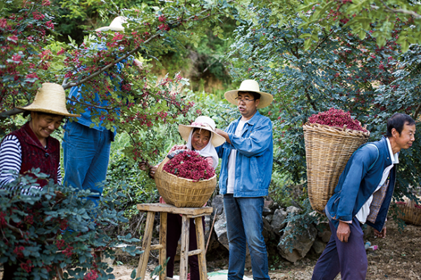 張志強(qiáng)(右二)與村民一同采摘花椒