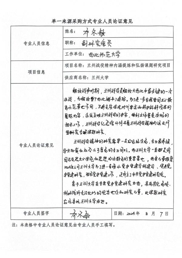 (2)由于本項(xiàng)目政治站位高,專業(yè)素養(yǎng)強(qiáng),學(xué)術(shù)權(quán)威和社會認(rèn)可度高,經(jīng)過省內(nèi)各高校在科研水平及有關(guān)蘭州戰(zhàn)役學(xué)術(shù)成果的綜合評估,戰(zhàn)役紀(jì)念館和其他院??蒲辛α繜o法完成項(xiàng)目所有工作,為保證蘭州戰(zhàn)役的基本史實(shí)和歷史地位,該項(xiàng)目應(yīng)由蘭州大學(xué)承擔(dān)課題的所有研究項(xiàng)目,該課題項(xiàng)目具有專業(yè)性和不可替代性,符合單一來源采購法規(guī),項(xiàng)目應(yīng)由蘭州大學(xué)承擔(dān)實(shí)施。