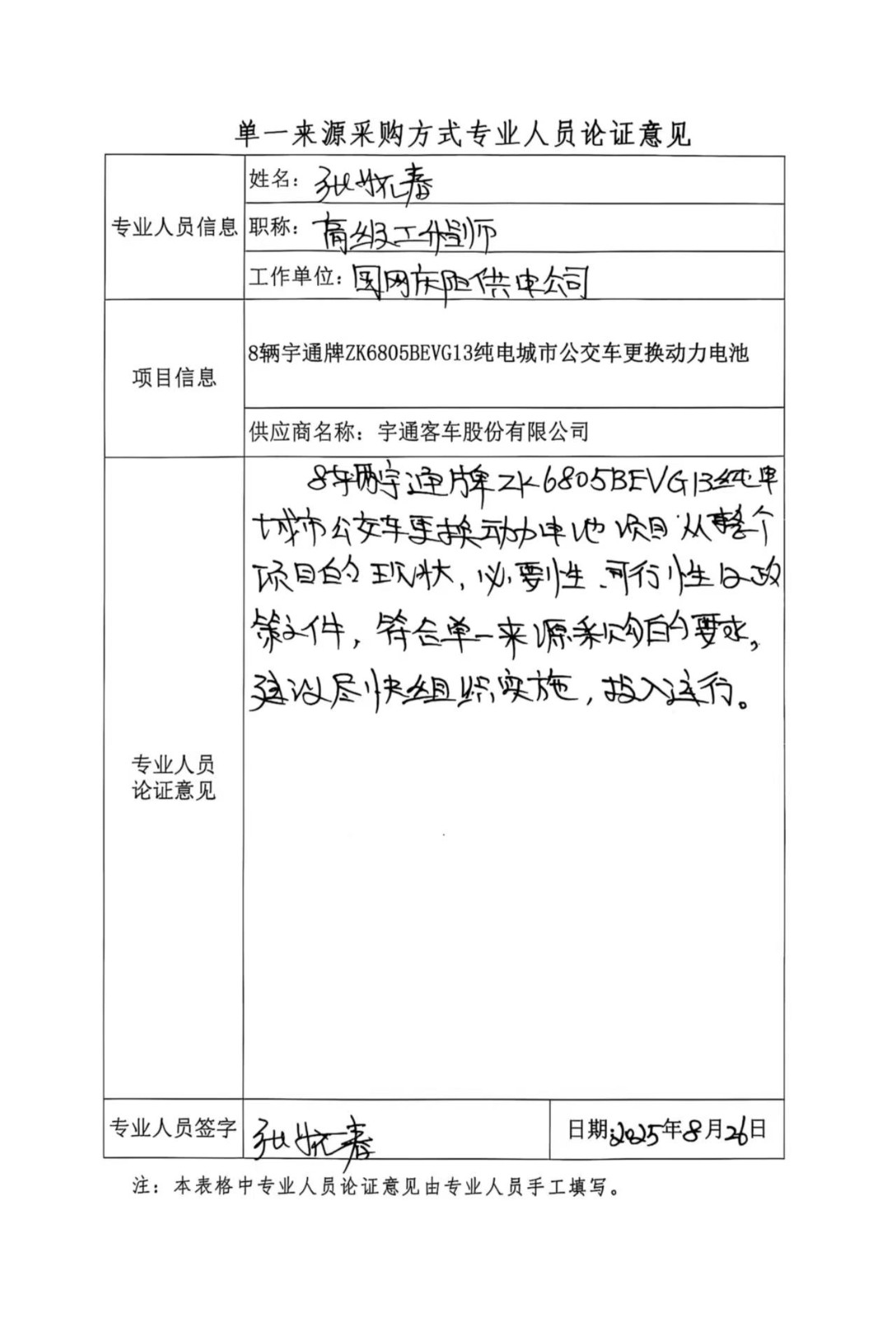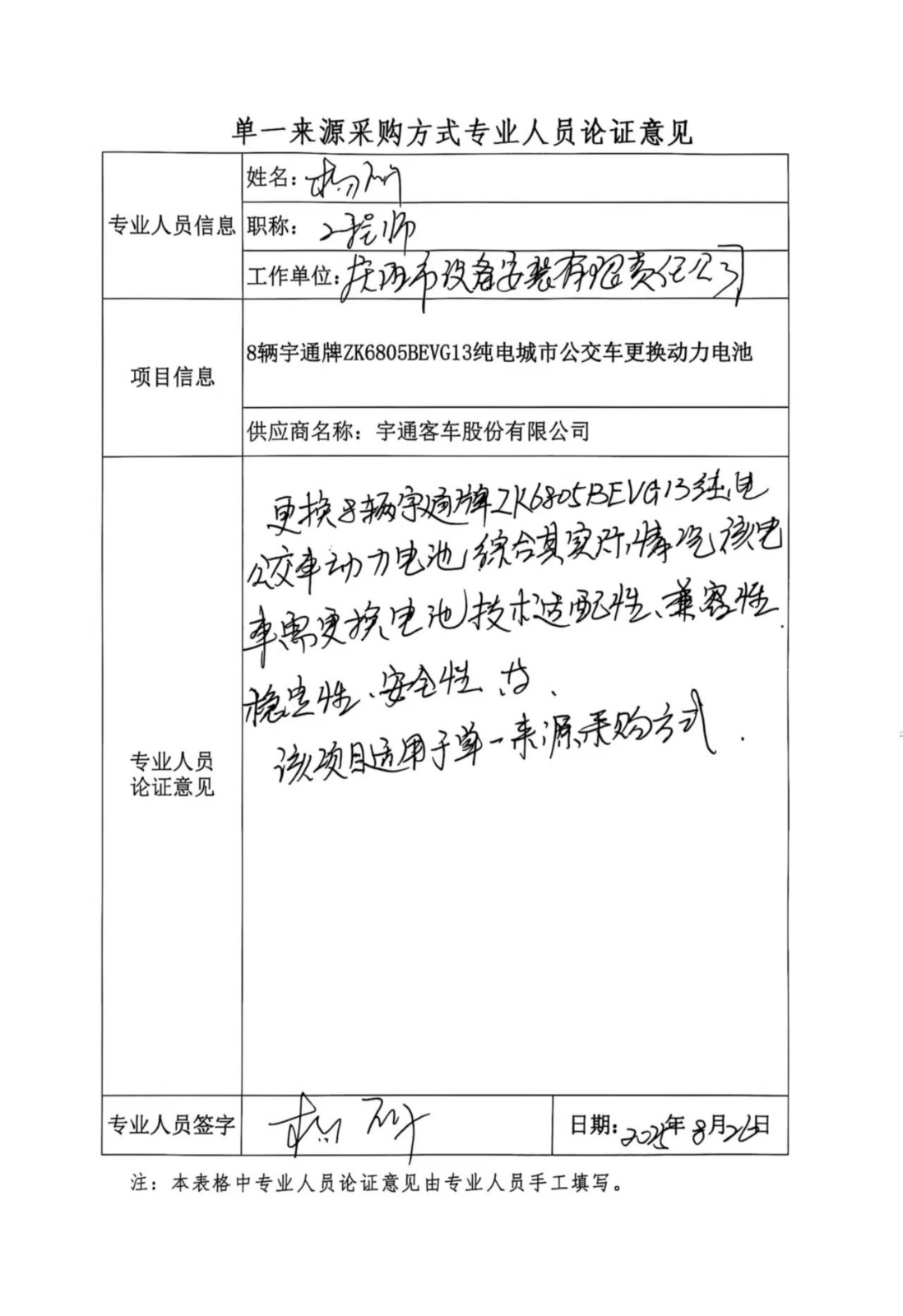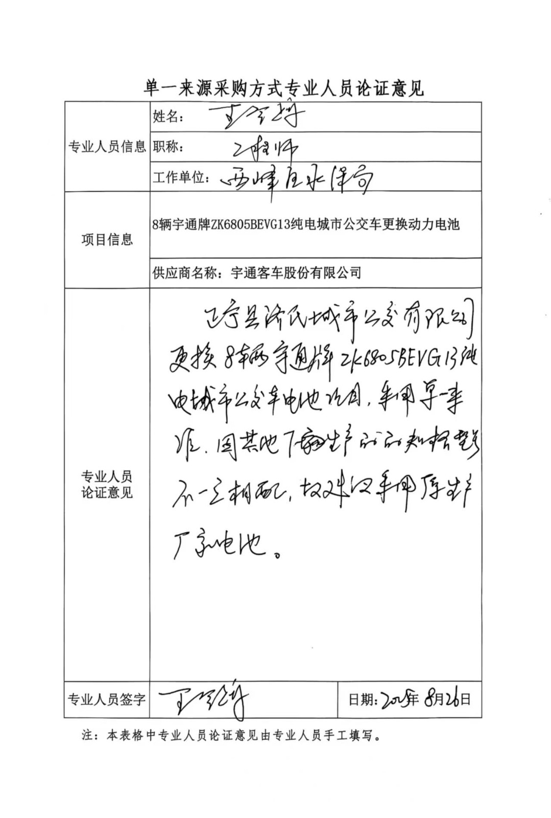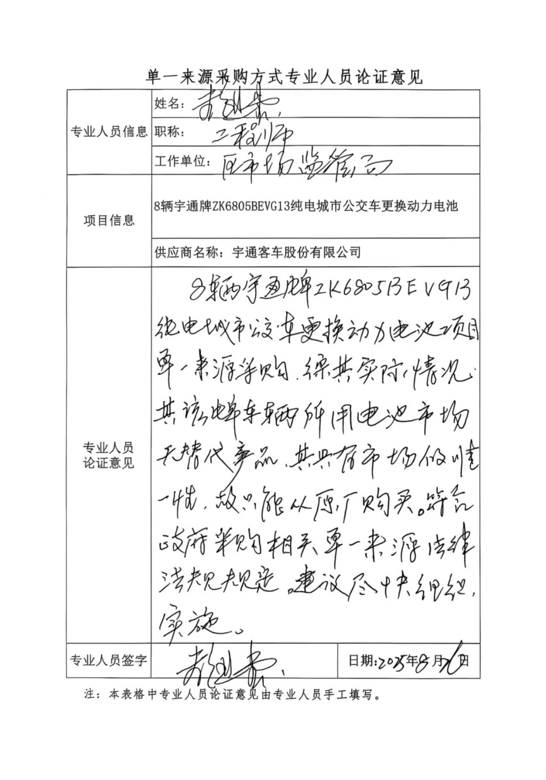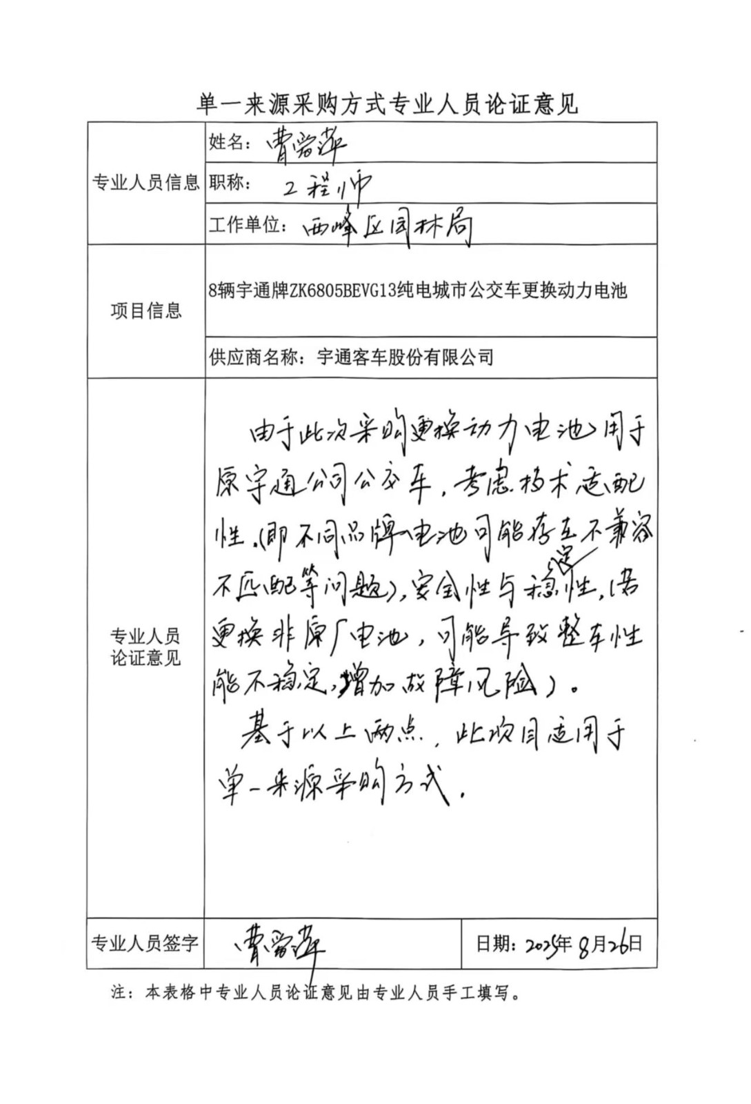 采用單一來源采購方式的原因及說明:本次更換動力電池項目,不是單純的購買配件后直接簡單更換即可,而須對整車性能進行重新評估,在滿足穩(wěn)定性、安全性、結(jié)構(gòu)可靠性、動力性及與其他新能源部件匹配性等基礎(chǔ)上,制定專業(yè)的動力電池更換方案;且須由專業(yè)技術(shù)人員對動力電池相關(guān)的全車新能源部件同步進行系統(tǒng)檢查,對整車的控制程序、控制策略進行調(diào)整,電池的控制系統(tǒng)必須同整車的控制系統(tǒng)相匹配兼容,以確保車輛后續(xù)運行的穩(wěn)定性、安全性。鑒于上述原因,根據(jù)相關(guān)規(guī)定,此項目滿足單一來源采購要求,只能從唯一供應(yīng)商處采購的,故本項目申請采用單一來源方式進行采購。