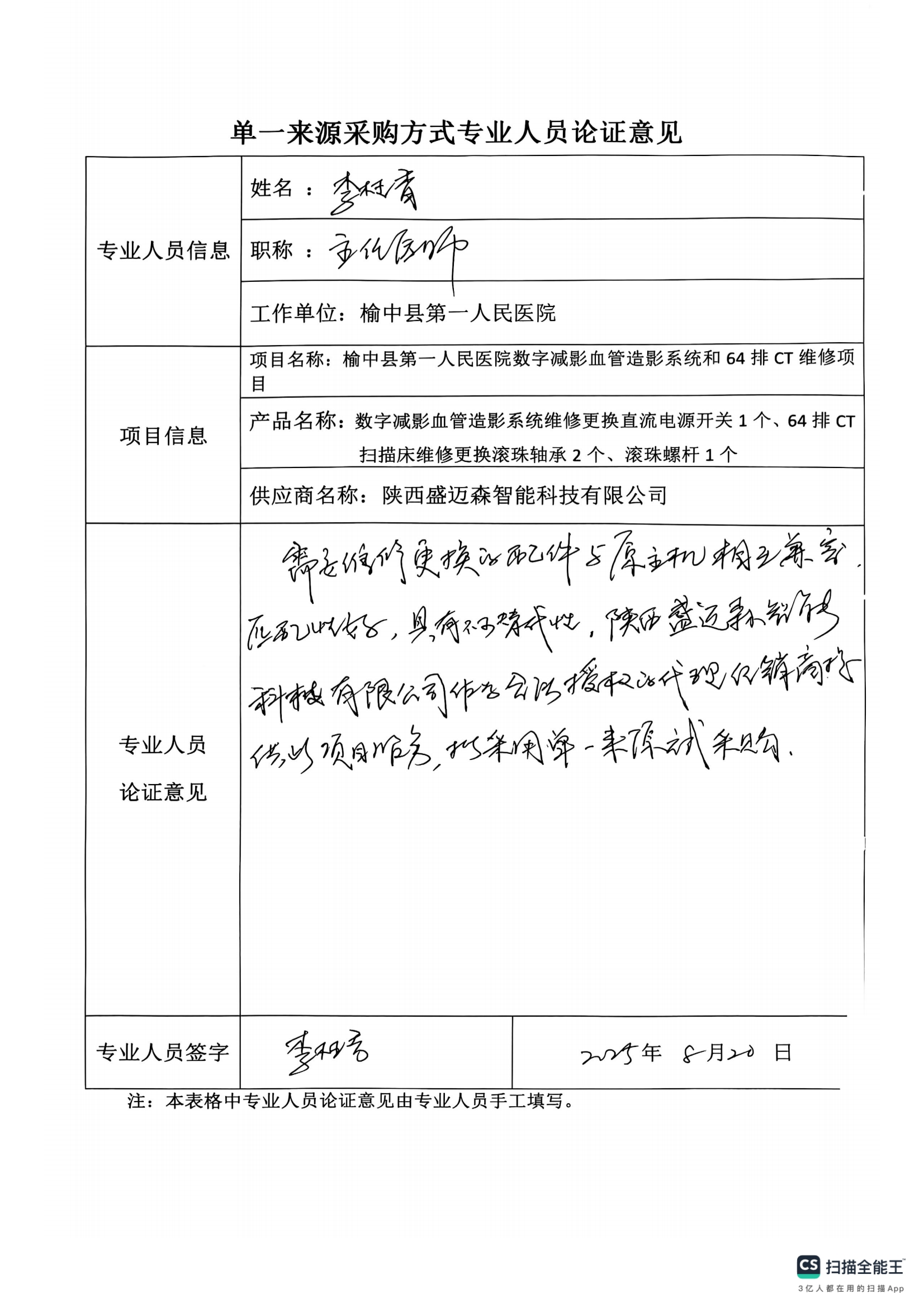 采用單一來源采購方式的原因及說明:需更換的直流電源開關、滾珠軸承及滾珠螺桿均為原主機配件,具有唯一性和不可替代性,陜西盛邁森智能科技有限公司是飛利浦(中國)投資有限公司的授權經(jīng)銷商,根據(jù)《榆中縣第一人民醫(yī)院采購管理內(nèi)部控制制度》第五十五條之規(guī)定,采用院內(nèi)單一來源采購方式。擬推薦陜西盛邁森智能科技有限公司為本項目單一來源供應商。